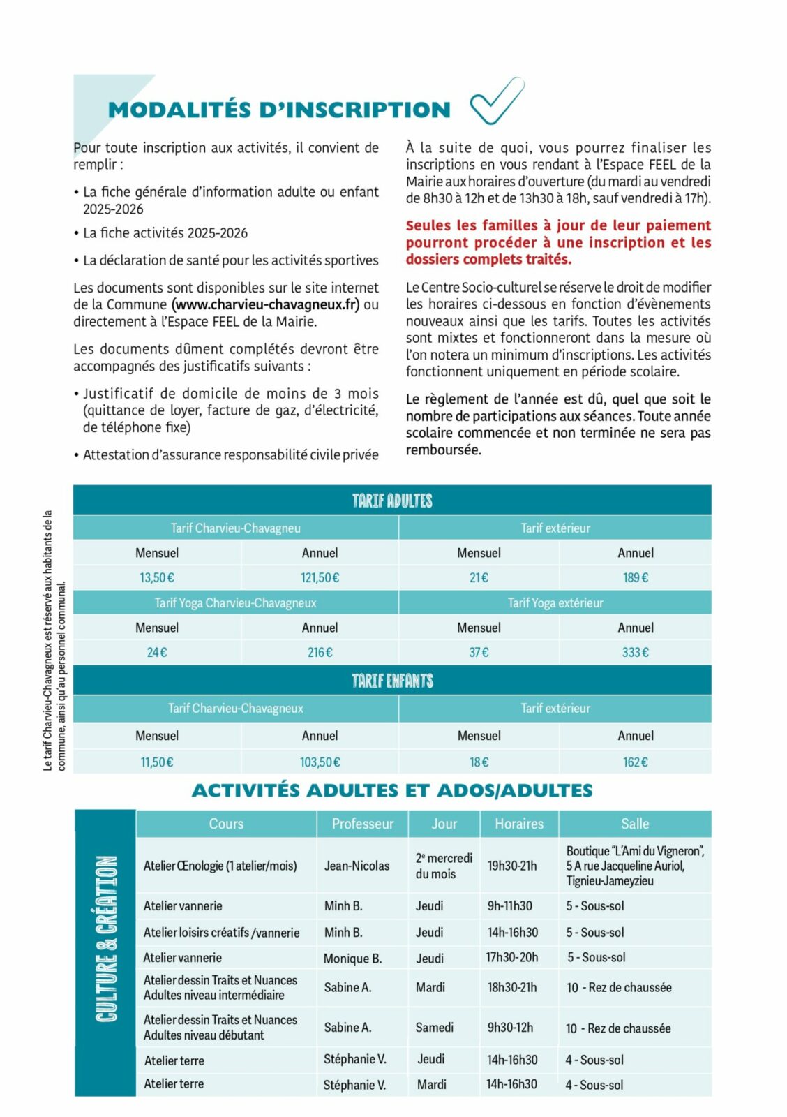Le Centre Socio-culturel se réserve le droit de modifier les horaires ci-joints en fonction d’évènements nouveaux.